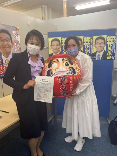 今日は、衆議院議員選挙に7度目の挑戦を予定している笠ひろふみさんの選挙事務所開きの神事が行われました。神事の後、見たことのないサイズの巨大なダルマに目を入れ必勝を祈願しました。笠さんの奥様も、足を骨折した不自由な状況でしたが、共に必勝を誓いました。