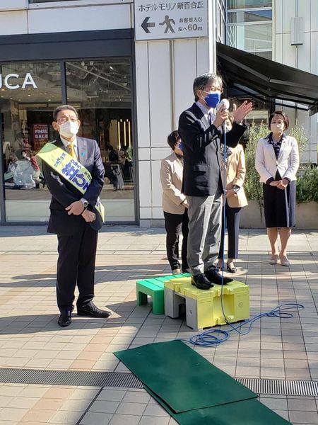 今日は、13時〜安住淳国会対策委員長が、18時〜野田佳彦元総理大臣が、笠ひろふみ候補の応援に新百合ヶ丘駅に来られました。駅前の狭い空間だったので、駅ご利用者の皆様にはご迷惑をおかけしましたが、大盛況でした。安住国対委員長の時はNHKなどカメラが2台の他、新聞等が取材に来られていたこともあってか、始まる前から多くの方に集まっていただきました。また、野田佳彦元総理大臣の時は、夕方ということもあり、当初は待っている方はまばらでしたが、話が始まった途端100人以上の方々に集まっていただきました。昔、我が家が船橋市に住んでいた頃、夫がよく「野田さんという人が、今日も津田沼で駅頭していた」と言っていましたが、野田元総理も笠ひろふみ候補と同様「街頭演説の鬼」というだけあり、聴衆を惹きつける話術の巧みさは、とても勉強になりました。安住国対委員長も、話の始まりは政治とは全く関係ない話でしたが、それで聴衆の関心を惹き、油断をさせたところで、本題に入り、グッと惹きつける技術は流石でした。野田元総理大臣の応援演説の後20時まで、笠ひろふみ候補と共に駅前で演説を続けましたが、本当に多くの方々にチラシを受け取っていただき、ボランティアでお手伝いいただいているみなさんも、手応え感じた活動となりました。