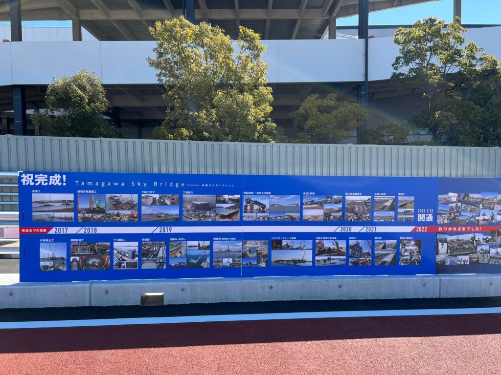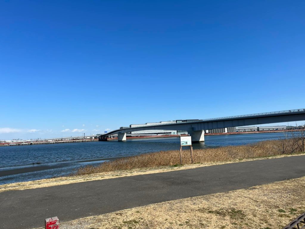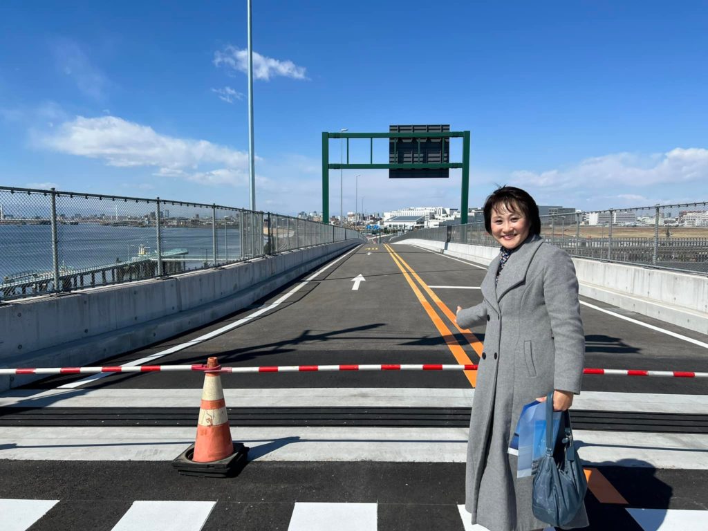 東京都大田区と川崎市殿町を結ぶ橋梁675mの多摩川スカイブリッジが、3月12日にいよいよ開通します。本来は、東京オリンピック・パラリンピックに間に合わせるため始まった工事ですが、橋下に、貴重な干潟があるため、環境に配慮した工事を選択することや長年積もった土砂を浚渫する必要があるなど、様々な課題をクリアしながら順調に進んでいましたが、令和元年東日本台風で大量の土砂が上流から流れ込み、改めて浚渫する必要が生じるなど、工期が延長されてきました。3月6日、快晴の空の下、事前に視察させていただきました。東京側は、環状8号線につながり、一方では、羽田空港第3ターミナル付近の駐車場に繋がるそうで、利便性が向上します。さらに、羽田空港の駐機場が正面に見え、富士山や滑走路も見えるなど、新たなビュースポットが誕生します。東京都県境に道路標識がありますが、この先は、速度規制がありますので、ご注意くださいね。原付バイクも通行禁止です。